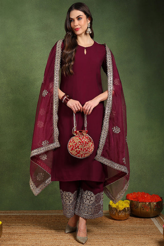 Burgundy Silk Blend Solid Straight Suit Set With Palazzo Style Bottom PKSKD2745