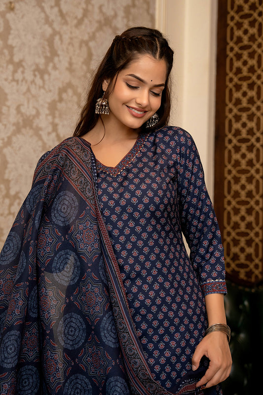 Navy Blue Rayon Blend Ajrakh Printed Straight Trouser Suit Set PKSKD2647