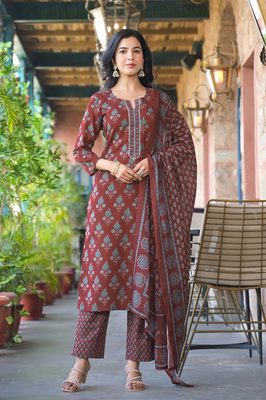 Brown Rayon Blend Floral Printed Straight Trouser Suit Set VKSKD2249