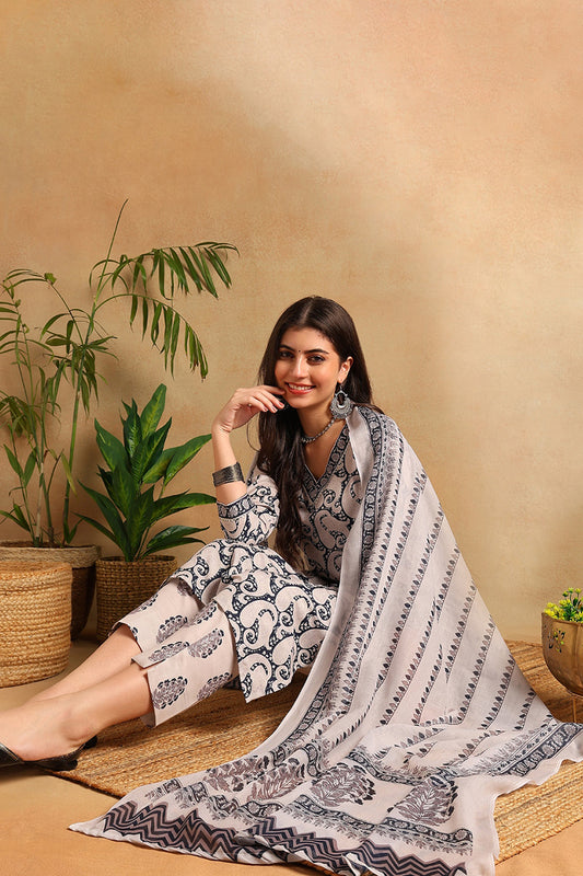 Navy Blue Rayon Blend Paisley Printed Straight Trouser Suit Set VKSKD2254