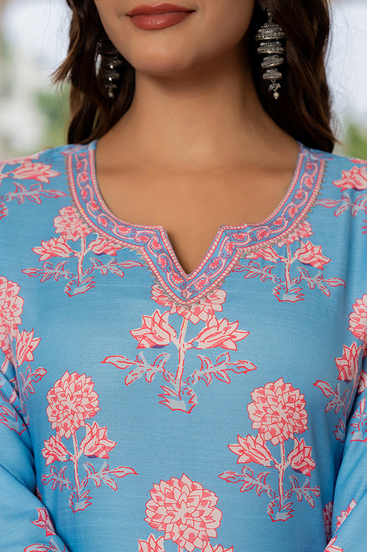 Blue Rayon Blend Floral Printed Straight Trouser Suit Set VKSKD2261