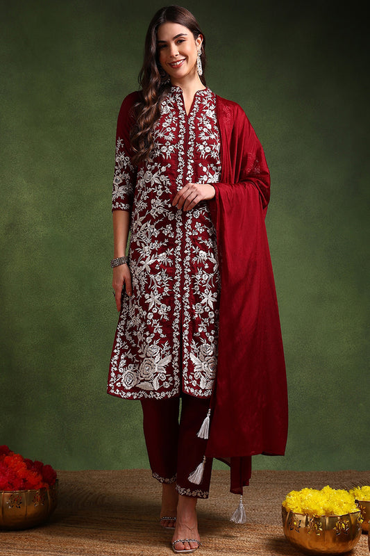Maroon Silk Blend Solid Embroidered Straight Suit Set PKSKD2215
