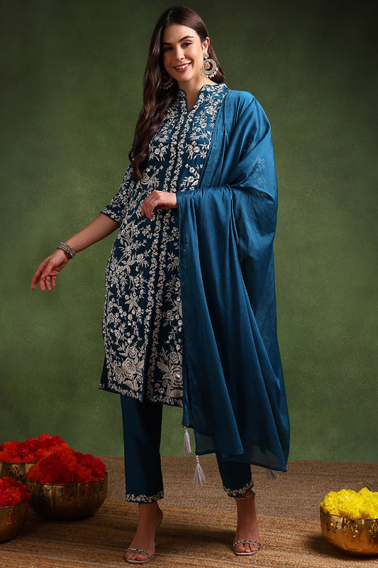 Teal Blue Silk Blend Solid Embroidered Straight Suit Set PKSKD2216