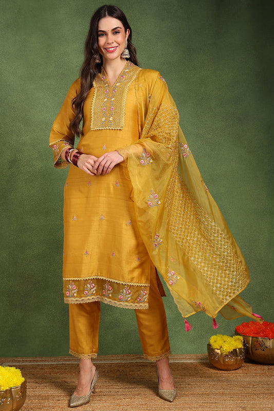Mustard Yellow Silk Blend Floral Embroidered Straight Suit Set PKSKD2240