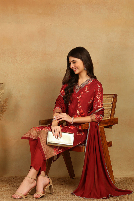 Maroon Rayon Blend Floral Printed Straight Trouser Suit Set PKSKD2526MRN