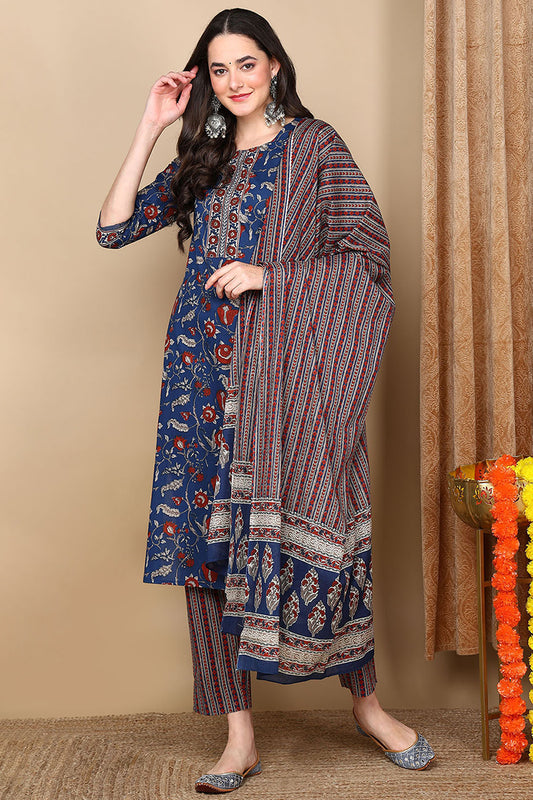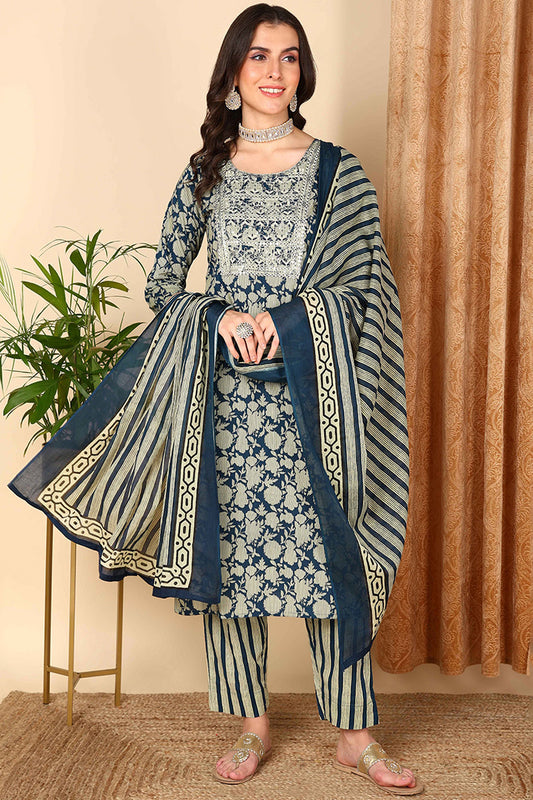 Navy Blue Rayon Blend Floral Embroidered Straight Trouser Bottom Suit Set VKSKD2212BLU