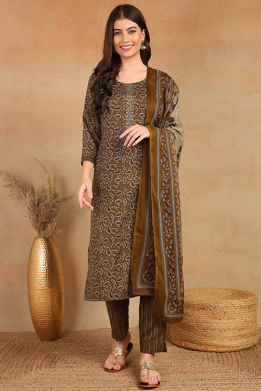 Brown Cotton Blend Ethnic Motifs Printed Straight Trouser Suit Set VKSKD2216BRN