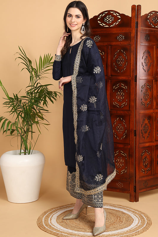 Navy Blue Silk Blend Solid Embroidered Straight Suit Set PKSKD2249