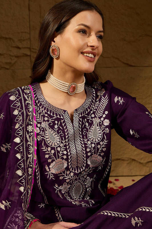 Purple Silk Blend Yoke Design Zari Straight Palazzo Suit Set PKSKD2488