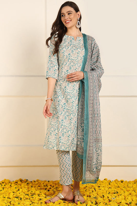 Teal Blue Pure Cotton Floral Printed Straight Suit Set JPSKD1033TIL
