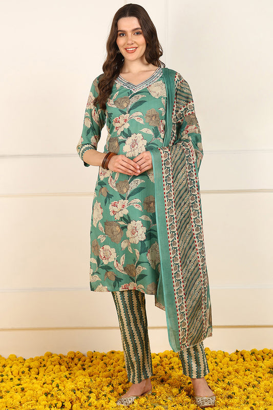 Green Cotton Floral Printed Straight Suit Set JPSKD1047GRN
