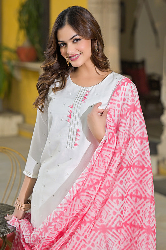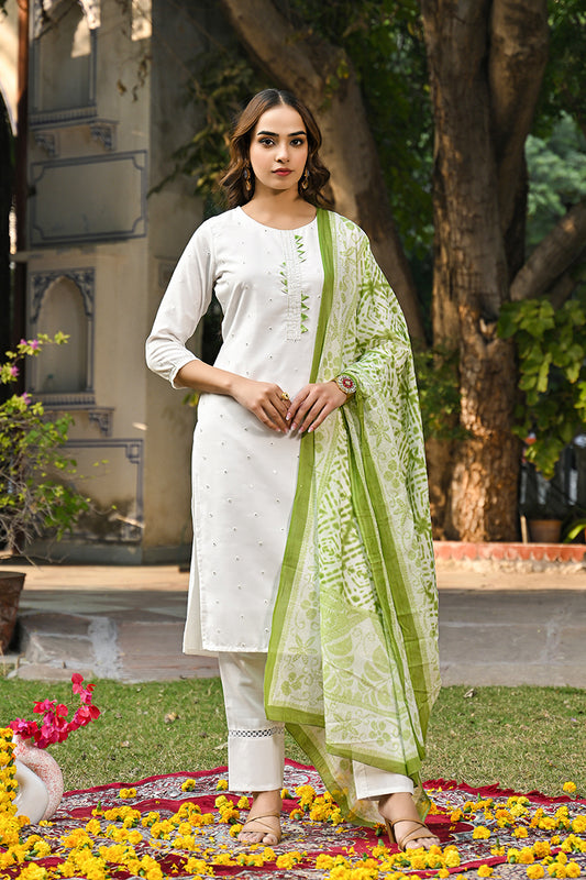 White Pure Cotton Floral Printed Straight Suit Set JPSKD1036GRN