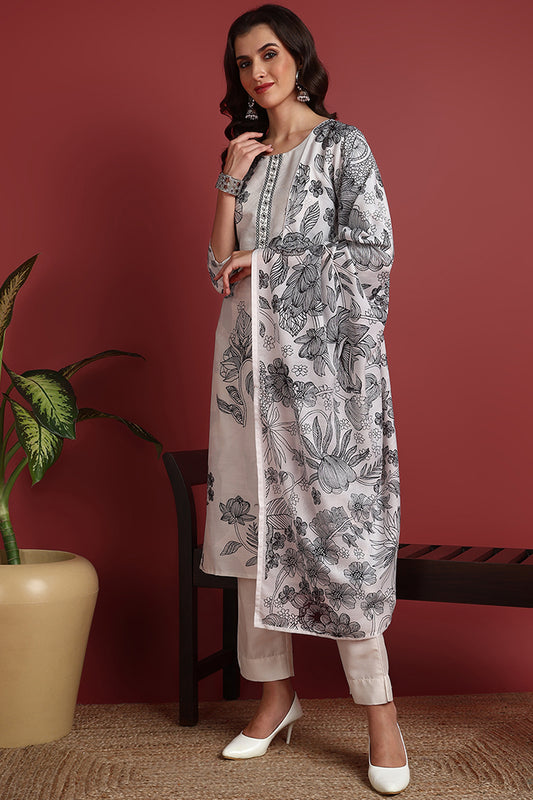 White Cotton Blend Floral Printed Straight Suit Set VKSKD2205