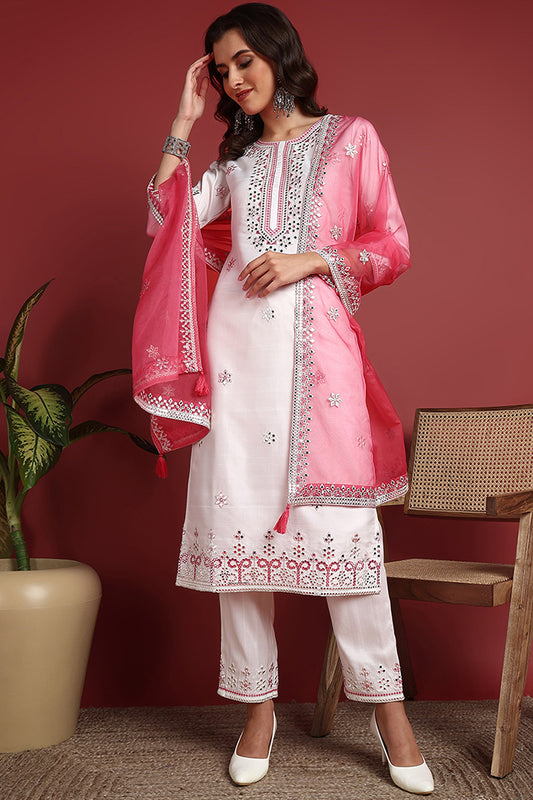 White Silk Blend Solid Embroidered Straight Suit Set PKSKD2422