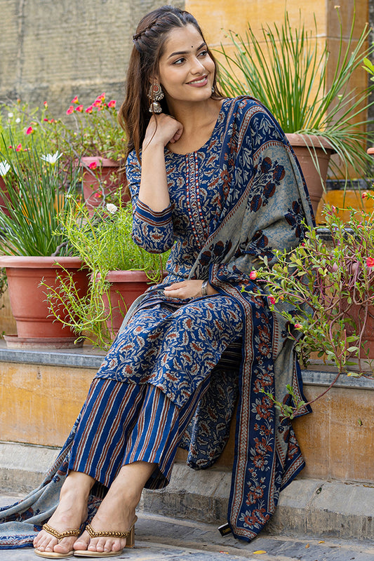 Blue Viscose Rayon Floral Embroidered Straight Suit Set VKSKD2179