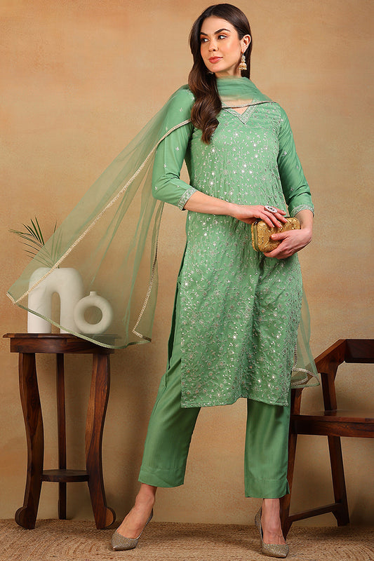 Green Silk Blend Solid Embroidered Straight Suit Set PKSKD2308
