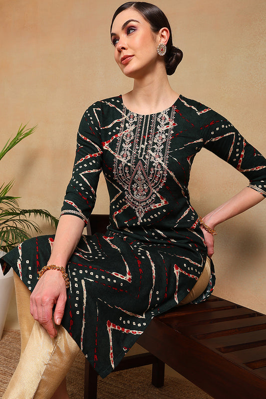 Green Cotton Blend Abstract Printed Straight Kurta VCK9563