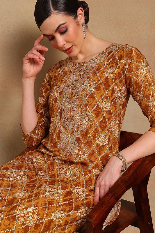 Mustard Yellow Silk Blend Solid Embroidered Straight Suit Set PKSKD2319