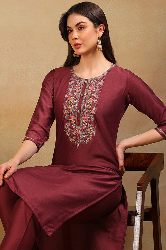 Maroon Silk Blend Solid Embroidered Straight Kurta VCK9580