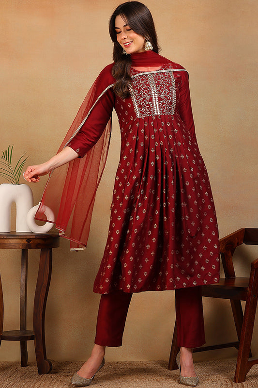 Maroon Silk Blend Solid Woven Design Flared Empire Suit Set PKSKD2295