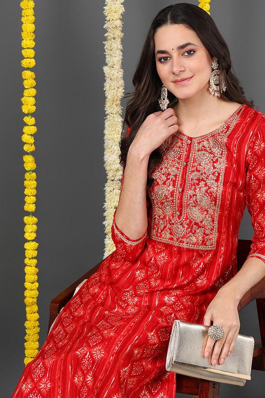 Red Viscose Rayon Ethnic Motifs Printed Straight Kurta VCK9635