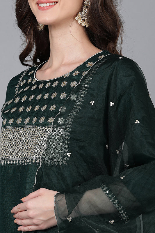 Green Poly Silk Solid Yoke Design Kurta Trousers With Dupatta PKSKD1589