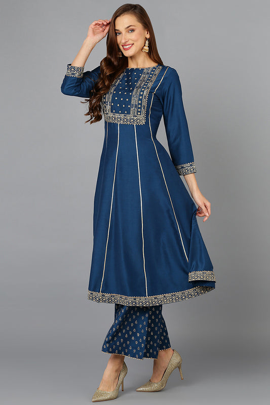 Teal Blue Silk Blend Ethnic Motifs Anarkali Suit Set PKSKD1930