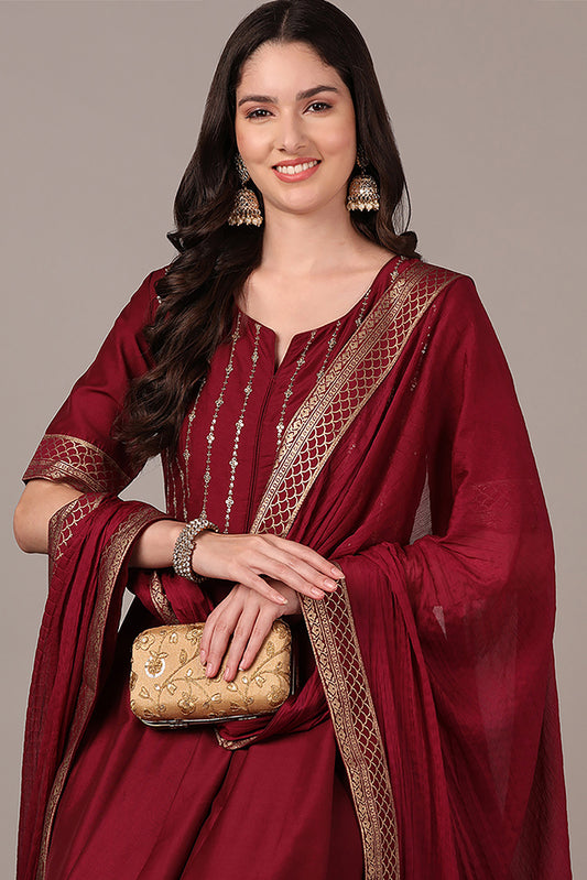 Maroon Poly Silk Solid Yoke Design Kurta Trousers With Dupatta PKSKD1587