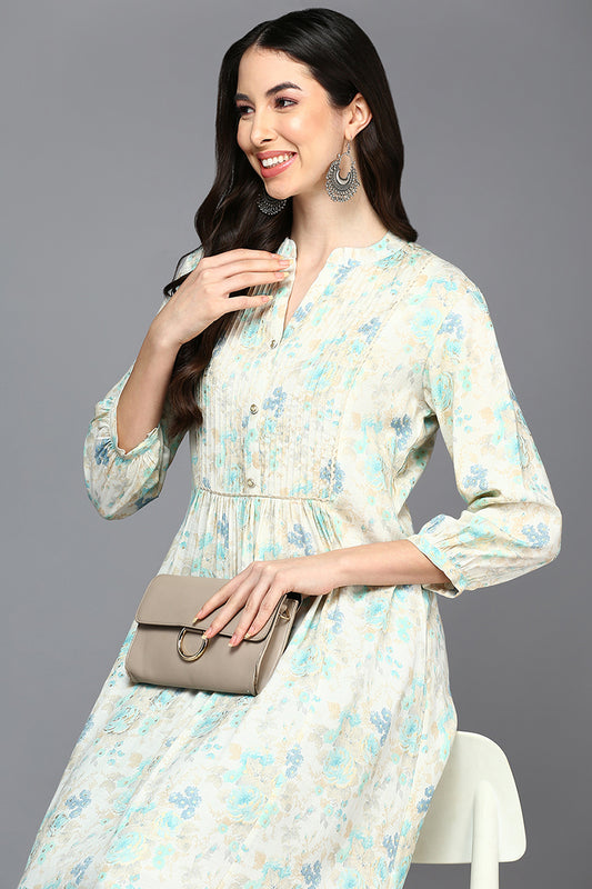 Off White Cotton Blend Floral A-Line Kurta VCK9419