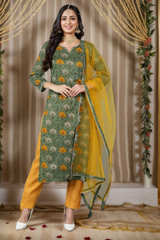 Green Rayon Blend Ethnic Motif Printed Straight Suit Set VKSKD1721