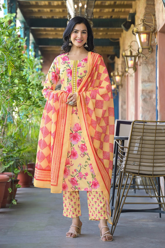 Yellow Rayon Blend Floral Printed Straight Kurta Trousers With Dupatta VKSKD2324