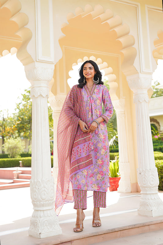 Purple Rayon Blend Floral Printed Straight Kurta Trousers With Dupatta VKSKD2337