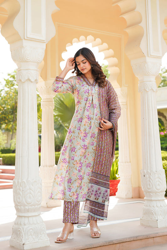 Green Rayon Blend Floral Printed Straight Kurta Trousers With Dupatta VKSKD2323