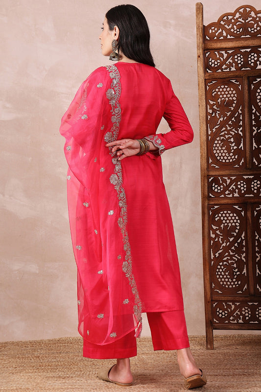 Pink Silk Blend Solid Embroidered Straight Palazzo Suit Set PKSKD2610