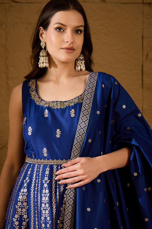 Blue Silk Blend Solid Embroidered Anarkali Kurta Bottom and Dupatta PKSKD3020