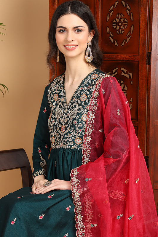 Green Silk Blend Solid Yoke Design Flared Suit Set PKSKD2159