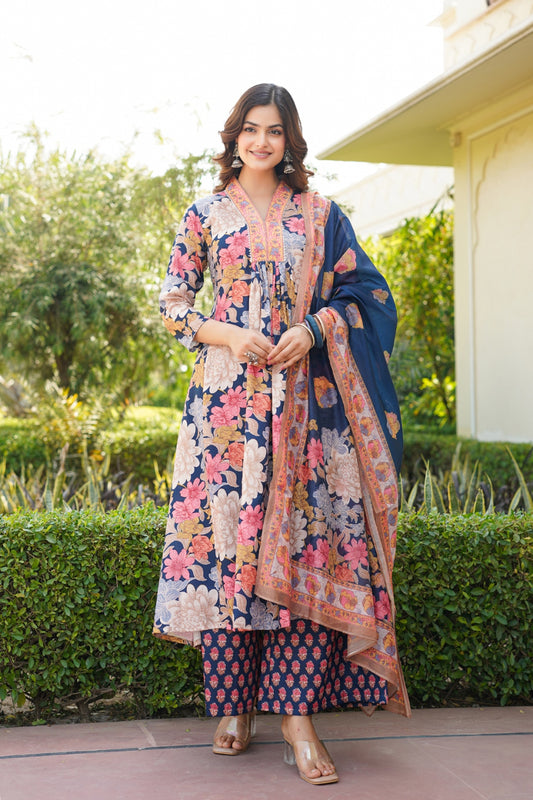 Navy Blue Rayon Blend Floral Printed A-Line Kurta Palazzo With Dupatta VKSKD2349