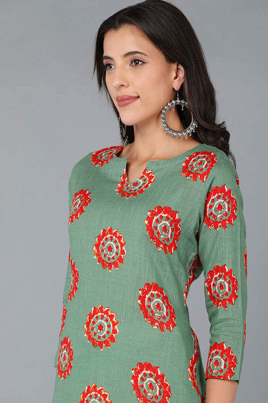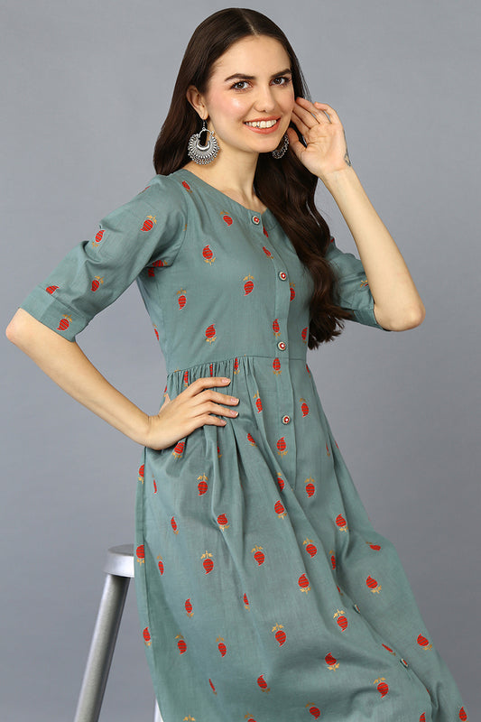 Sea Green Cotton Ethnic Motifs Flaired Kurta VCK9339