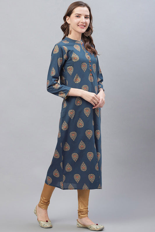 Teal Blue And Gold Coloured Printed Straight Kurta VCK1765E
