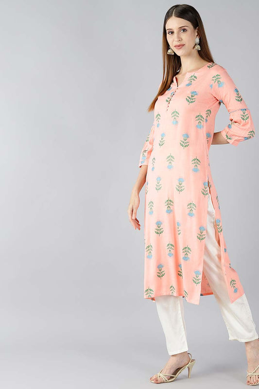 Women Peach Coloured & Blue Printed Straight Kurta VCK1666