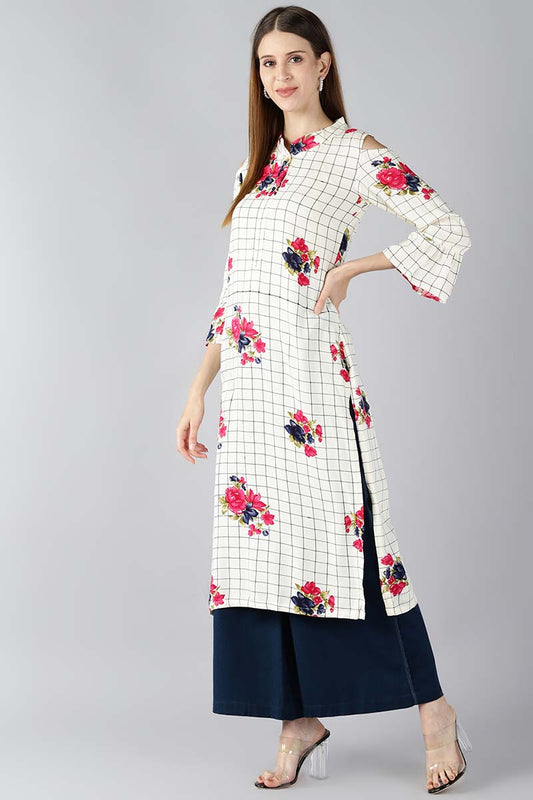 Women Off White And Black Checked Straight Kurta With Floral Print VCK1896E