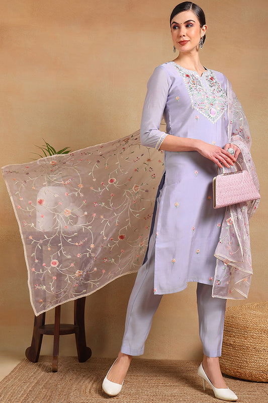Purple Silk Blend Solid Embroidered Straight Regular Suit Set PKSKD2028