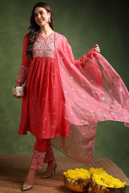Pink Silk Blend Solid Embroidered Flared Suit Set PKSKD2144