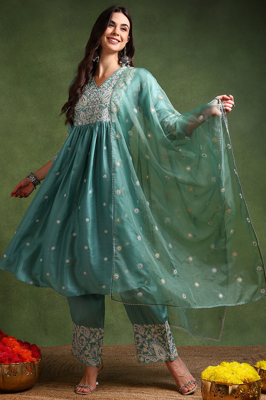Teal Blue Silk Blend Solid Embroidered Anarkali Suit Set PKSKD2735
