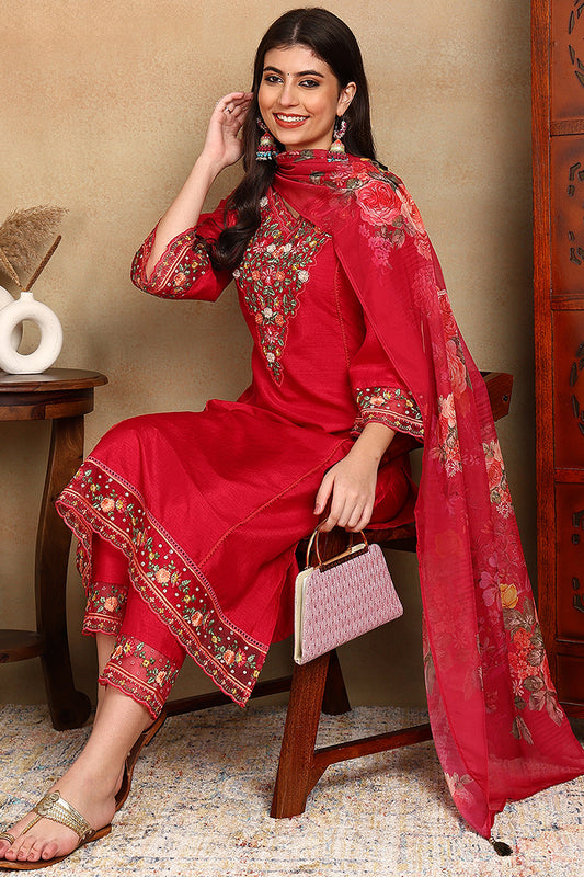 Rani Pink Silk Blend Solid Embroidered Straight Trouser Bottom Suit Set PKSKD2472