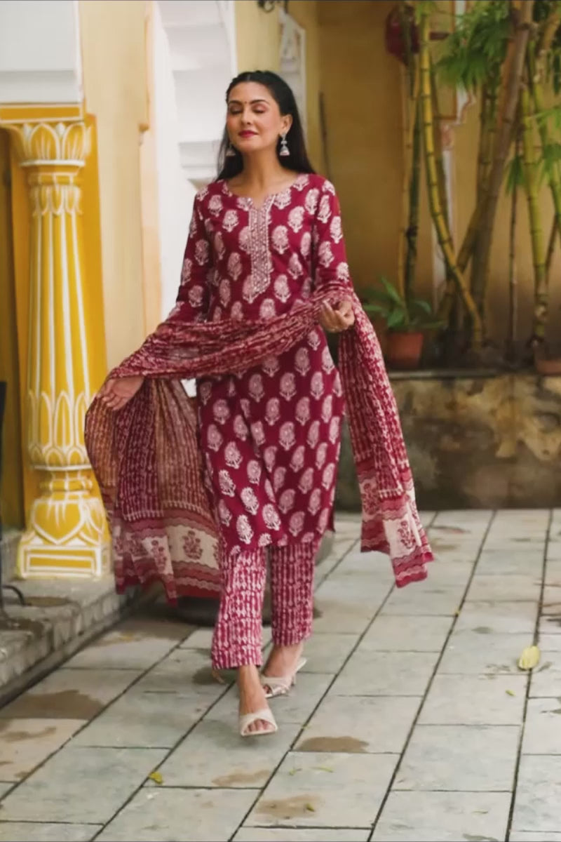 Ahika Women Burgundy White Printed Kurta And Palazzo is an iconic blend where comfort meets elegance. The plush Rayon Blend maroon fabric feels comfortable against the skin, and detailed traditional Indian prints make the kurta set a classic regular Indian wear. It comes with an embroidered dupatta and a straight pant style palazzo for a contemporary look.
