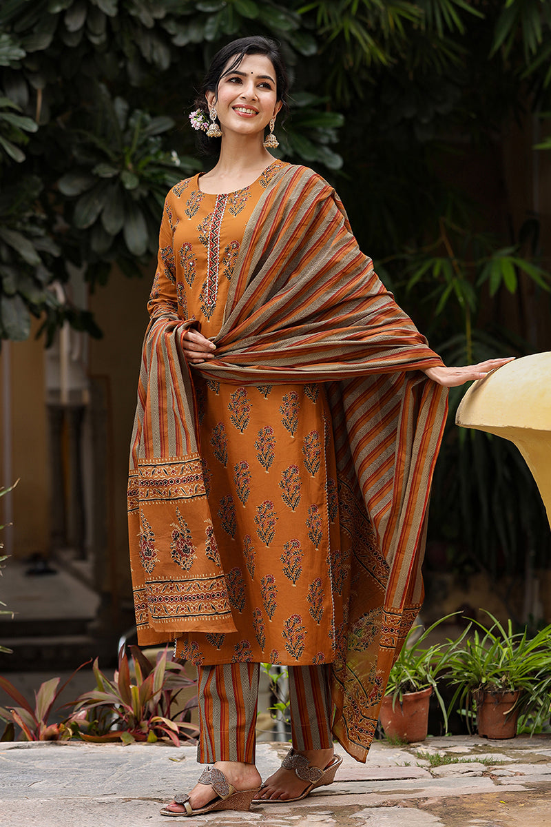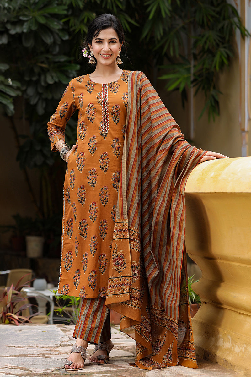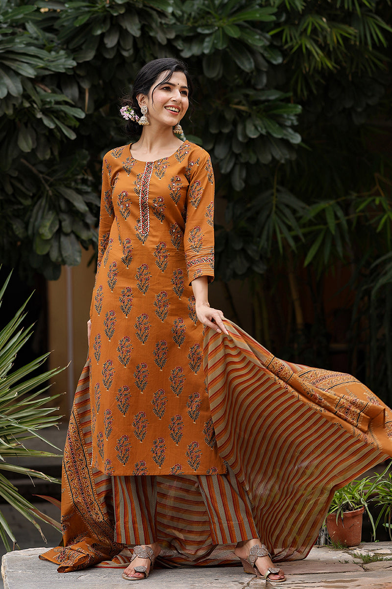 Add a touch of new unique color Kurtis to your wardrobe and shop olive brown rust orange printed Rayon Blend kurta. The Rayon Blend kurta for women includes a printed kurta, slip-on closure rust orange trousers and a printed rust brown dupatta. The Kurti features a unique round neck, three-quarter sleeves and single pocket sequinned detail. It is a perfect addition to your daily work wear wardrobe for every season.