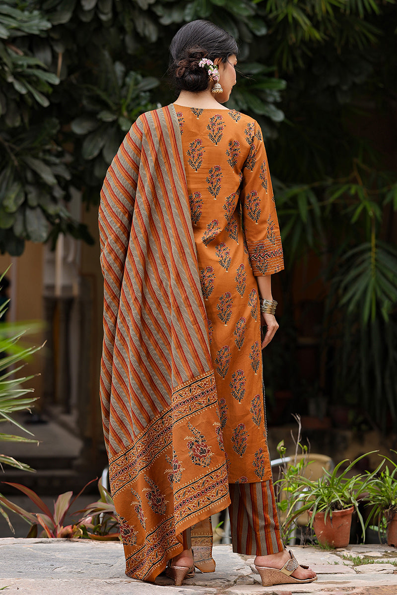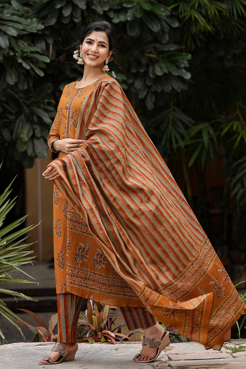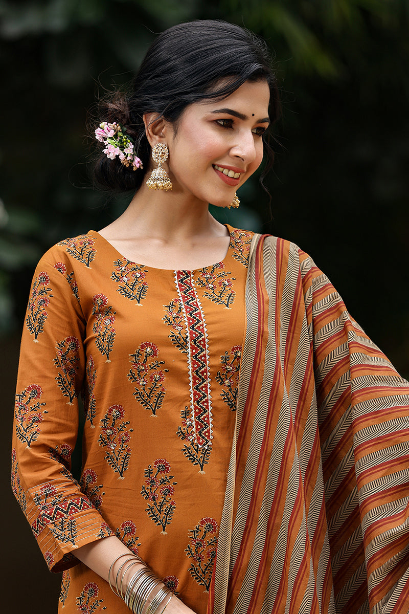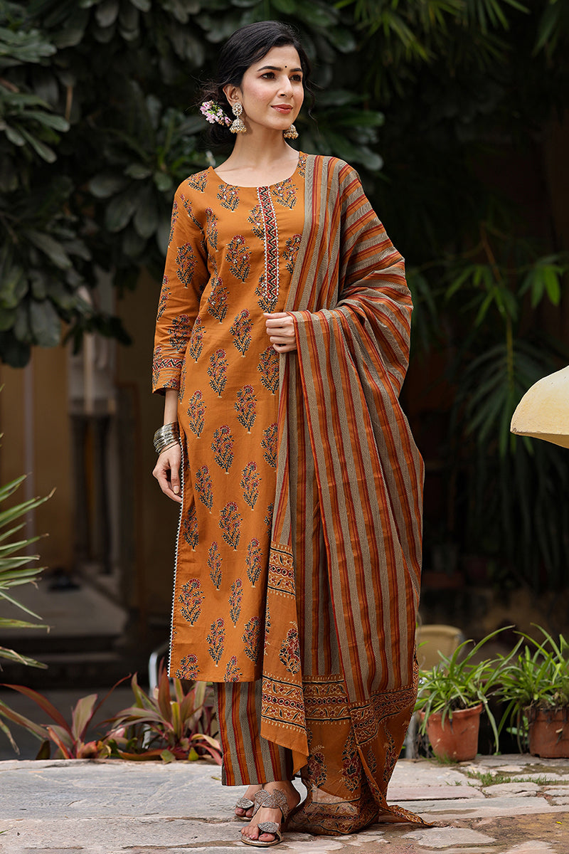 Add a touch of new unique color Kurtis to your wardrobe and shop olive brown rust orange printed Rayon Blend kurta. The Rayon Blend kurta for women includes a printed kurta, slip-on closure rust orange trousers and a printed rust brown dupatta. The Kurti features a unique round neck, three-quarter sleeves and single pocket sequinned detail. It is a perfect addition to your daily work wear wardrobe for every season.