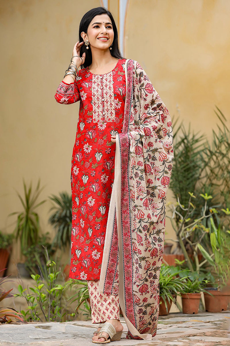 Red Rayon Blend Floral Printed Suit Set VKSKD1235