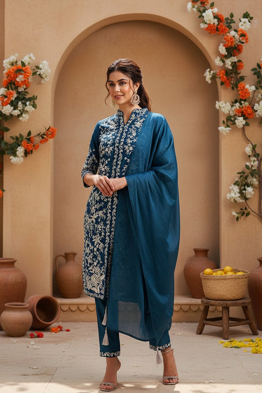 Teal Blue Silk Blend Solid Embroidered Straight Suit Set PKSKD2216